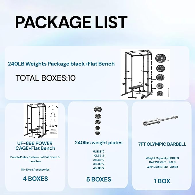 - VERSATILE AND ACCESSORIES COMPLETE:This UF-896 is the most versatile, heavy duty power rack system on the market. Attachments included Tricep rope、Ankle strap、T-bar、lat pull-down bar、a pair of cable handles/heavy duty J-Hooks/Dip bars/Safety bars、6-peg weight plate storage、360 degree landmine、pulley system and band pegs. With 1000 Pound Capacity Power Cage, this power cage gives you the flexibility for various strength training workout, within a safe environment and in a compact space.