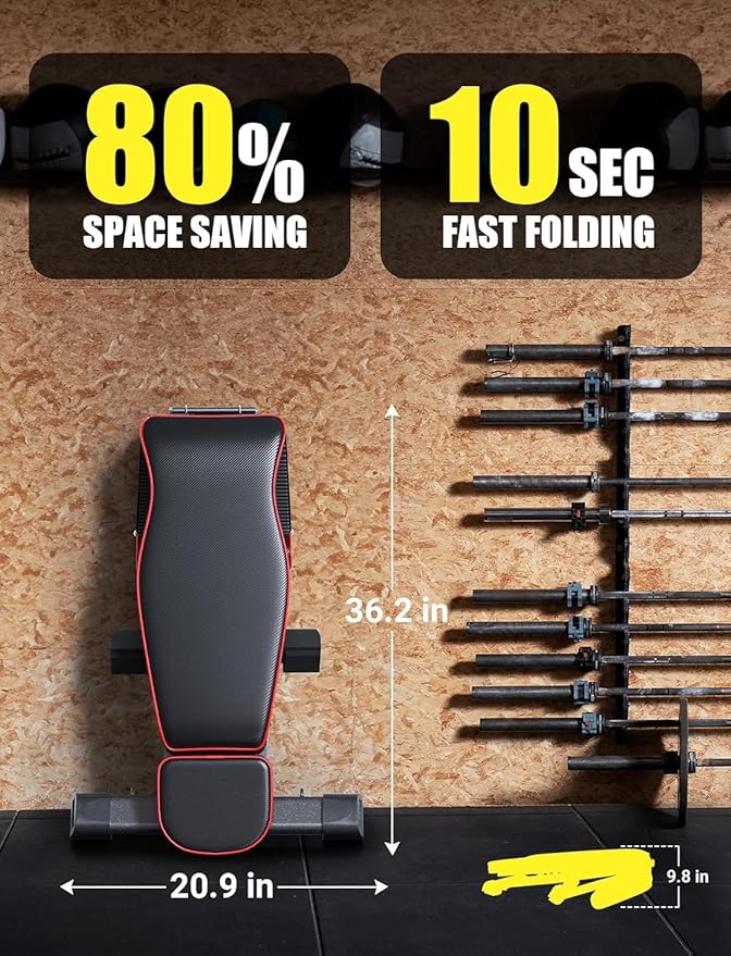 - γππ% πππππ ππππππγMeasuring 36.2"L x 20.9" W x 9.8"H when folded, simply pull out 2 pins and lay down the backrest to store the foldable weight bench under the bed or around the corner, which will save up to 80% space in your home gym!